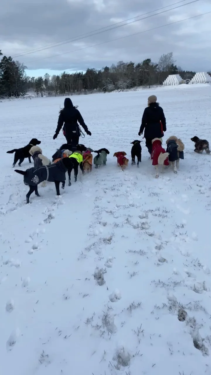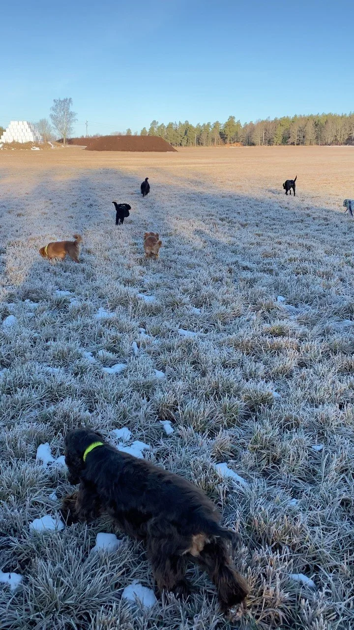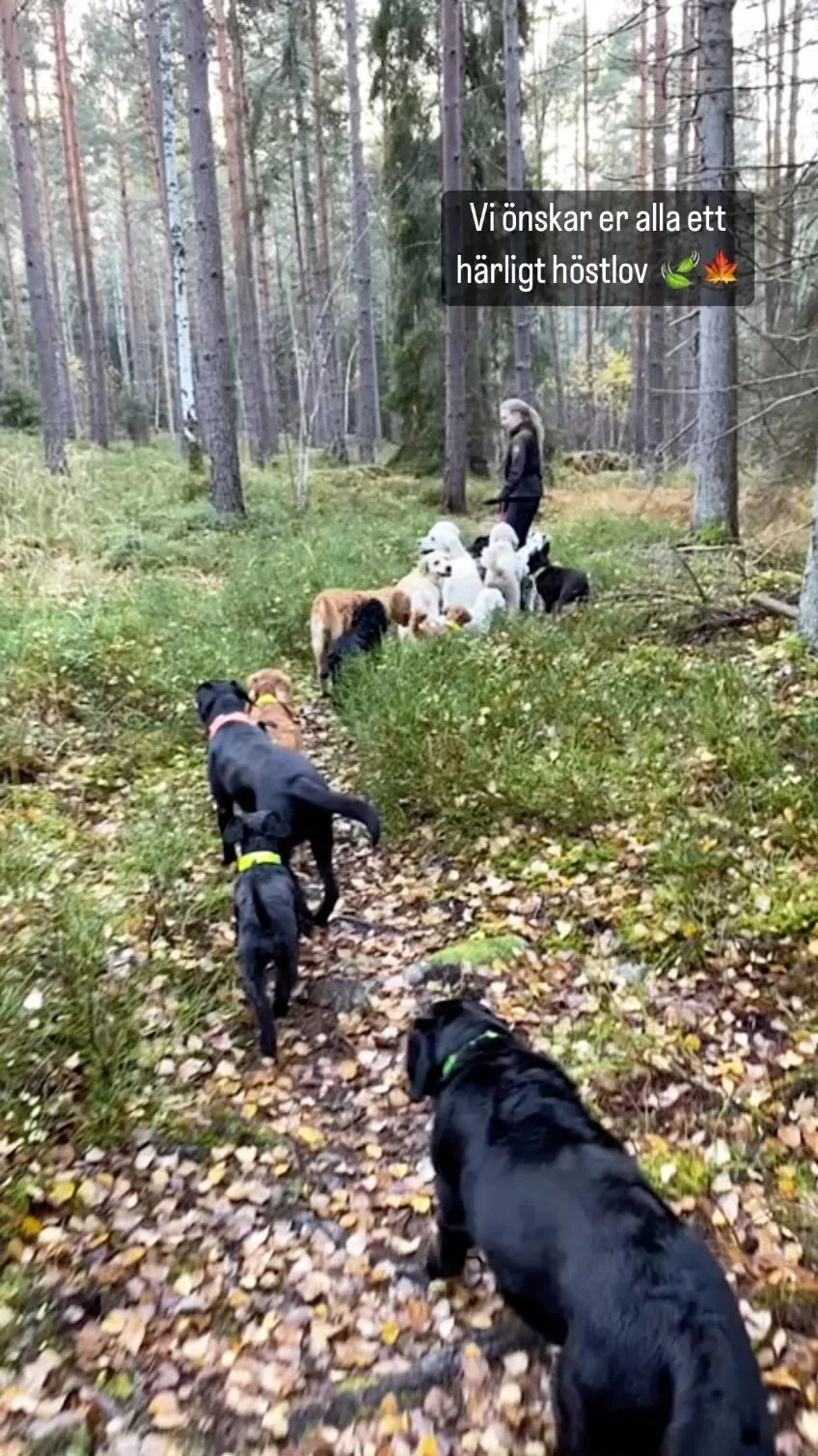 Hunden följer sina morgonrutiner och rastas ordentligt på morgonen av ägare. Hunden lämnas hemma för att sedan bli upphämtad. När alla hundkompisar är upplockade åker vi ut till skogen. Promenerar och följer träningsschemat. Hundarna lämnas hem och strax kommer alla hussar och mattar hem. Hunden rastas av er vid hemkomst och ni fortsätter kvällsrutinerna tillsammans.